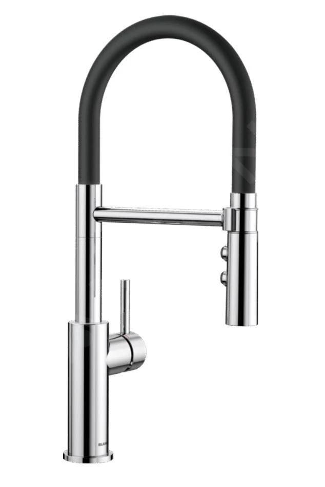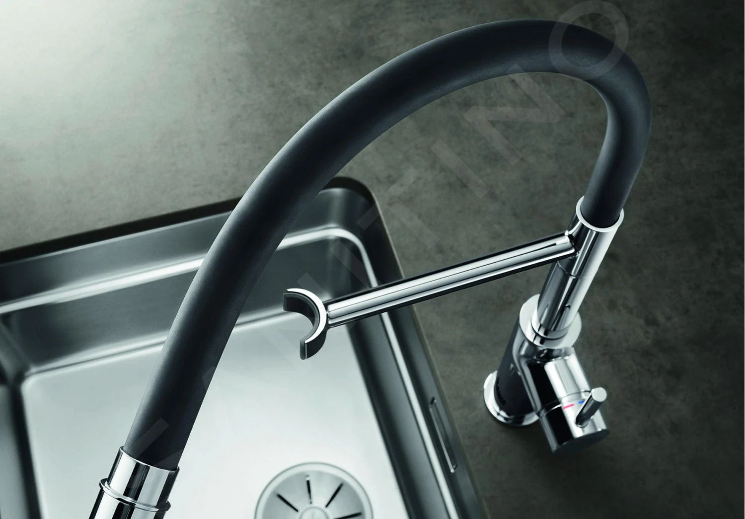 Blanco Catris S es una de las griferías de fregadero más lujosas y elegantes. El flexo de ducha negro se complementa elegantemente con elementos cromados. El resultado es un grifo de cocina distintivo y visualmente espléndido que no sólo dominará tu cocina, sino que también se convertirá en un práctico ayudante.