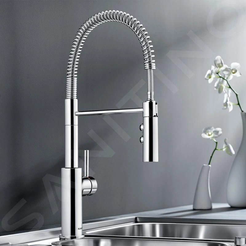 Blanco Catris S está equipado con un brazo giratorio flexible con un rango de rotación de 360°. Una característica muy práctica e impresionante de este grifo es la ducha extraíble con dos tipos de chorro, entre los que se puede cambiar pulsando un botón.