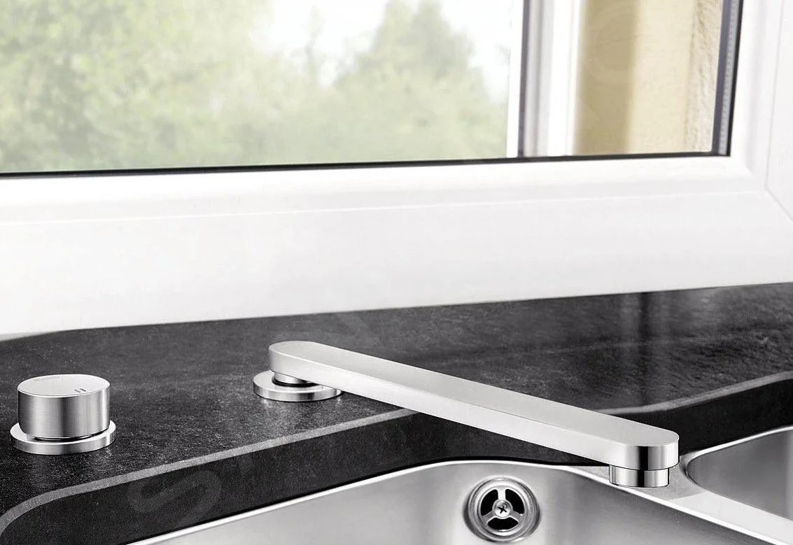 Grifo de fregadero futurista y minimalista con opción de montaje frente a una ventana