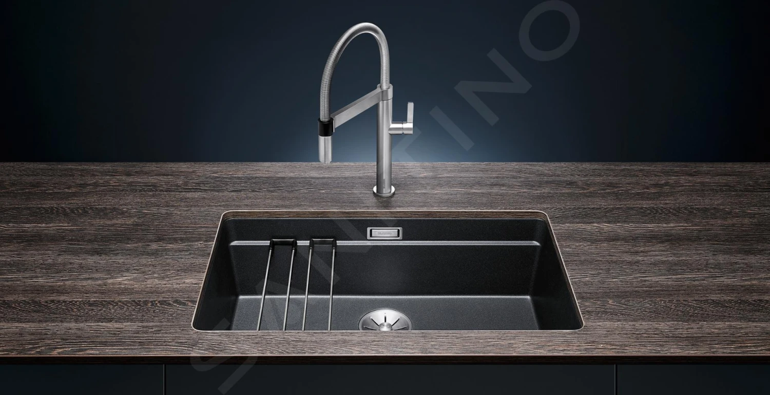 Imagina un fregadero de silgranite moderno y muy elegante sin escurridor en el popular color antracita, que además está equipado con guías universales en las que puedes colocar, por ejemplo, una sartén caliente. Eso es exactamente el Blanco Etagon 700. Te enamorará por su calidad, practicidad y deslumbrante diseño. Está fabricado con un material especial SILGRANIT® PuraDur®, compuesto en un 80% de granito, que destaca por su máxima dureza y resistencia.
