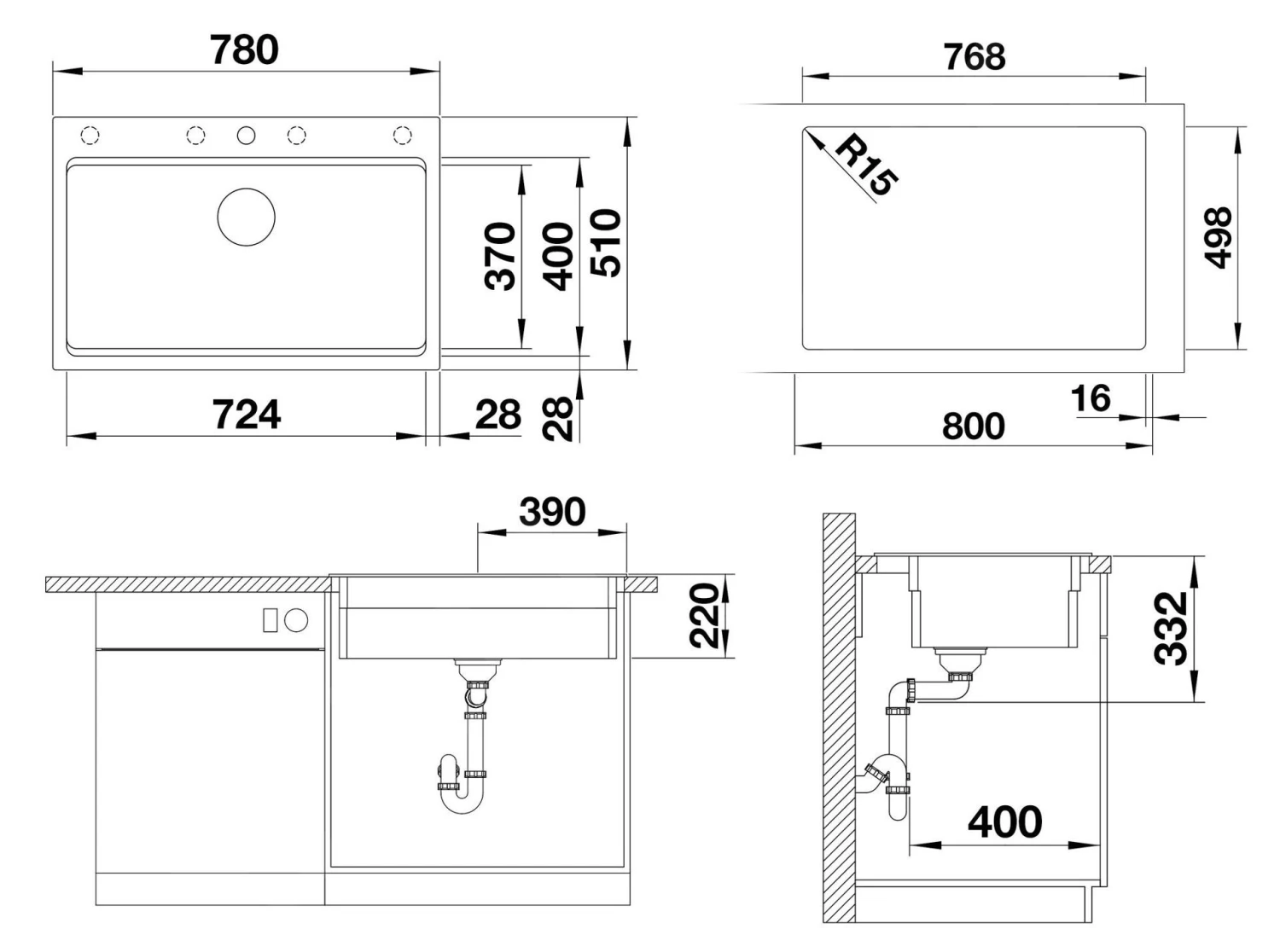 - dimensiones totales de fregadero: 780 x 510 mm