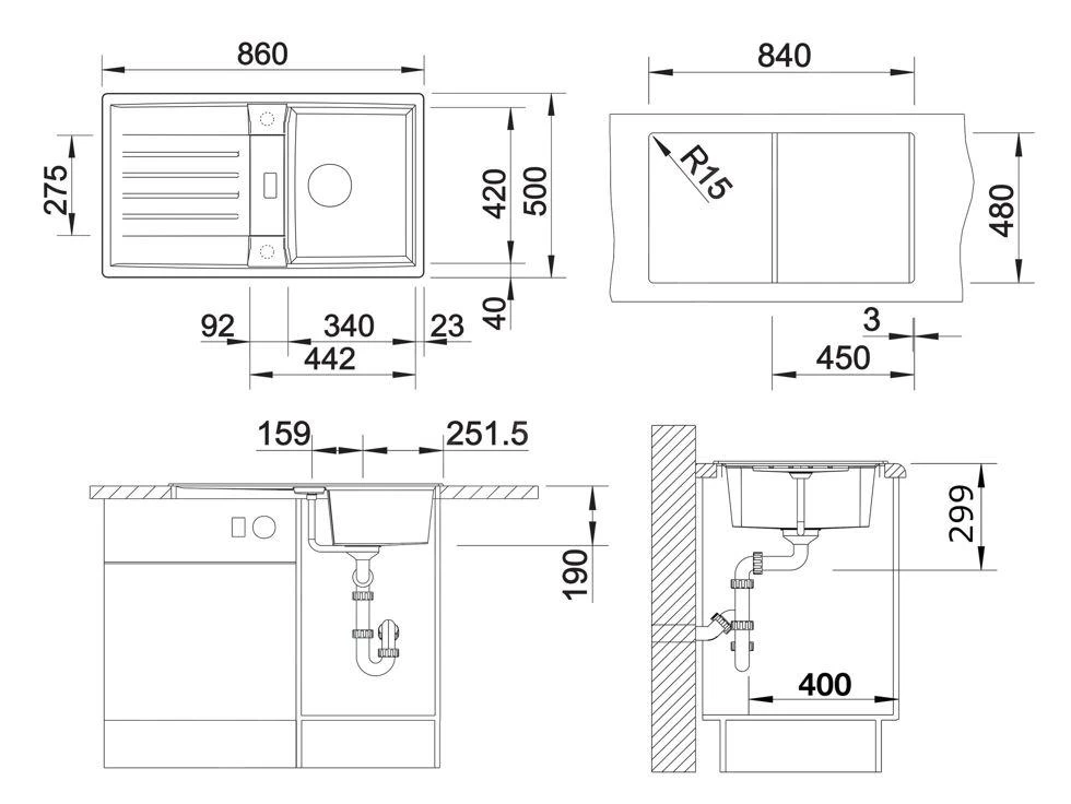 - dimensiones del seno de fregadero 340 x 420 mm