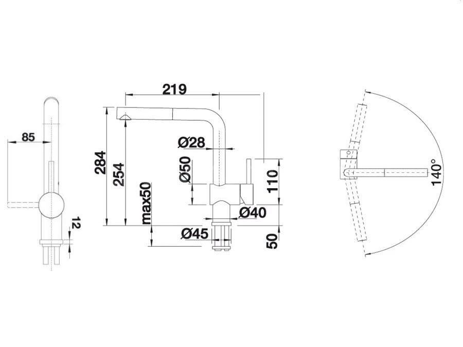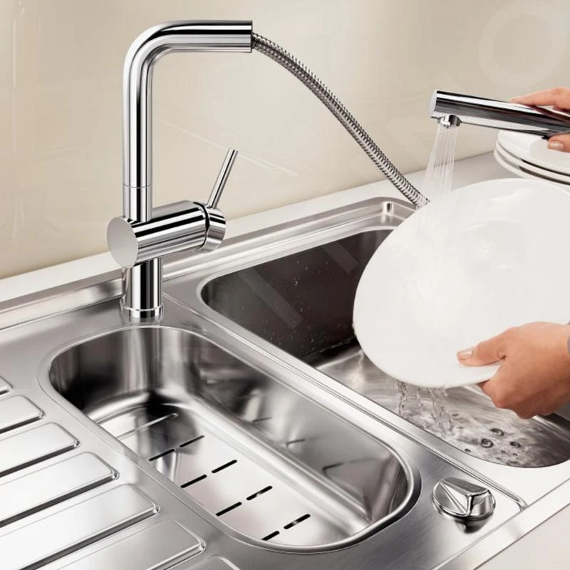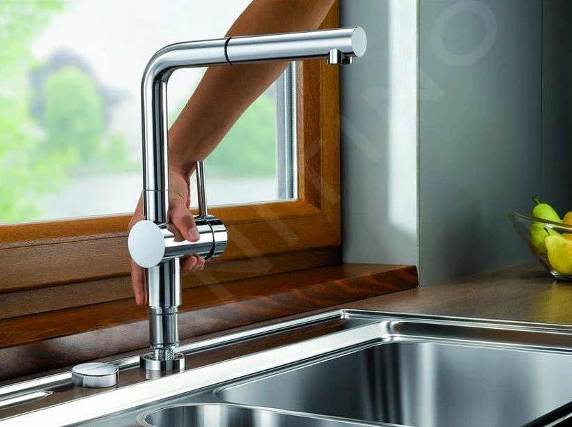 ¿Buscas un grifo de fregadero adecuado para instalarlo bajo una ventana? El Blanco Linus S-F está diseñado para ello. Su funcionamiento es sencillo: hay que tirar de él hacia arriba y colocarlo a un lado. Luego puedes abrir la ventana de par en par. El caño giratorio puede girar en un rango de 140°. Necesitas una distancia mínima de al menos 45 mm entre el fregadero y el marco de la ventana.