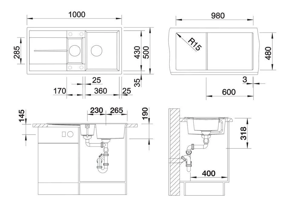 - juego de desagüe y rebosadero con tubo que ahorra espacio