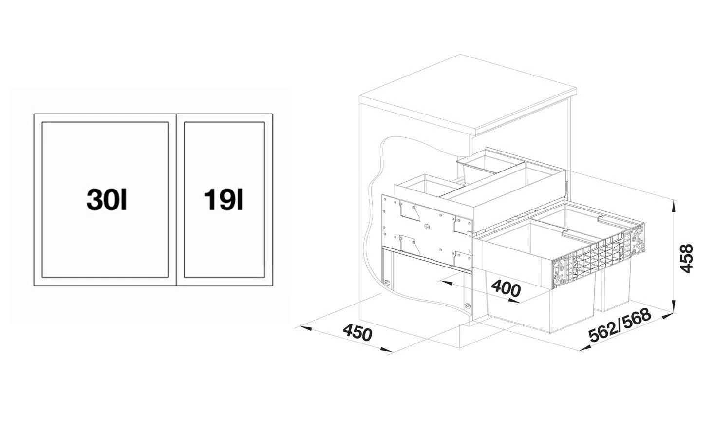 - recipientes: 1 x 30 l, 1 x 19 l, 1 x cajón