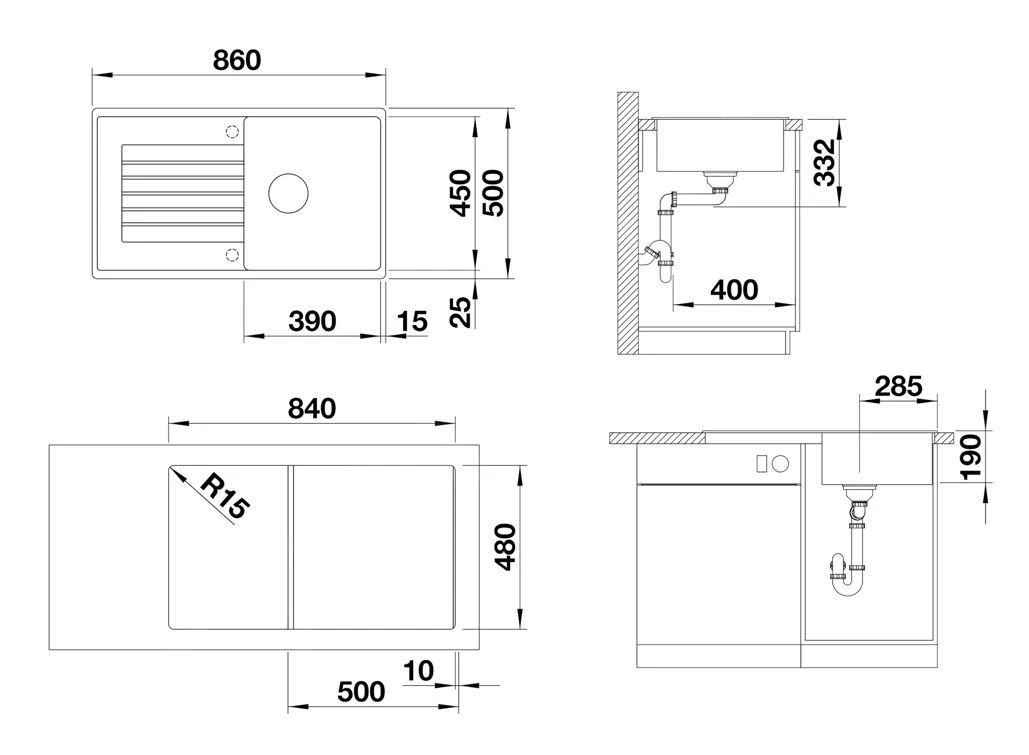 - dimensiones del seno de fregadero 390 x 450 mm