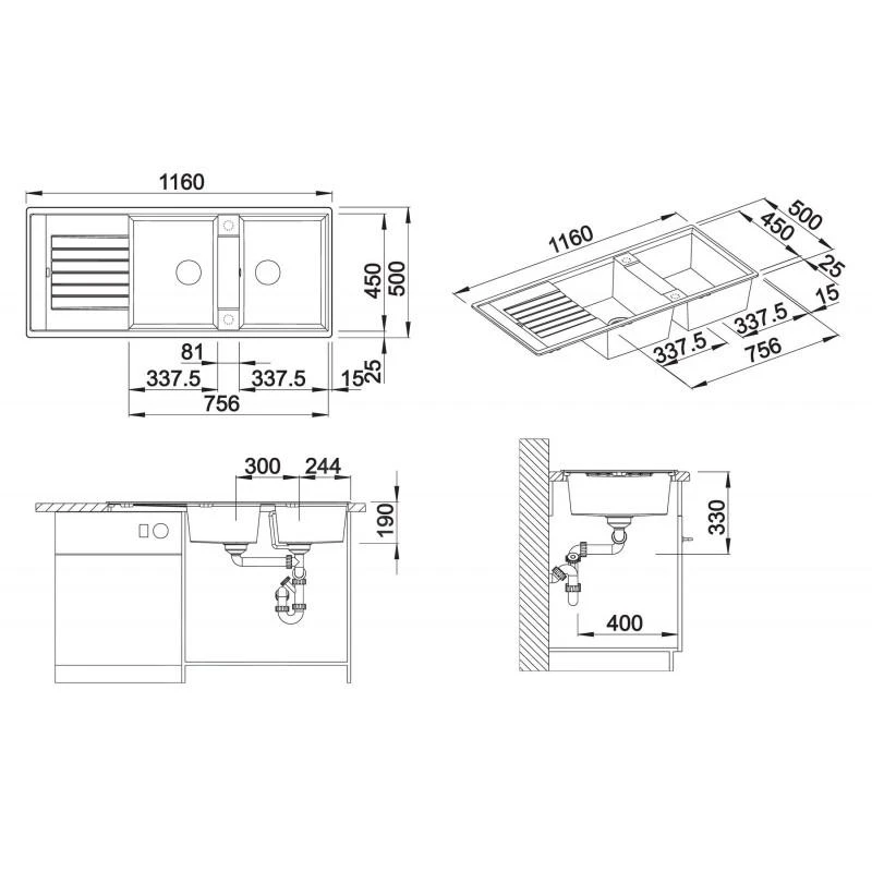El fregadero Zia 8 S está diseñado para el montaje superior en un mueble bajo con una anchura de 800 mm. Sus dimensiones totales son 1160 x 500 mm. Cada uno de los senos mide 337,5 x 450 x 190 mm. El paquete incluye dos válvulas de colador con control de desagüe manual, un juego de desagüe con tubo para ahorrar espacio y accesorios de montaje.